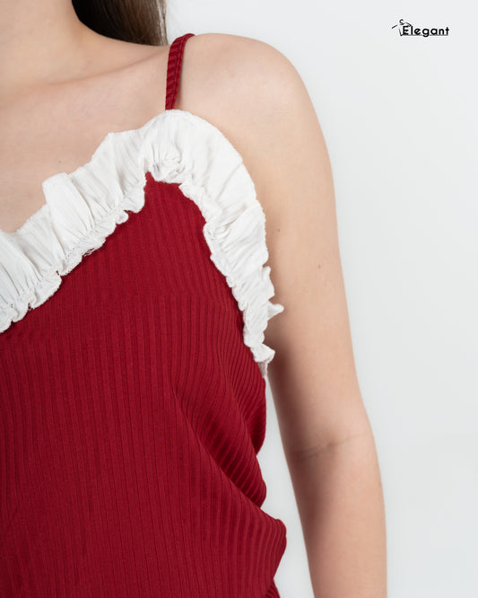 Straps Ribbed PJ Pants - Contrast ruffles - Ruby Red
