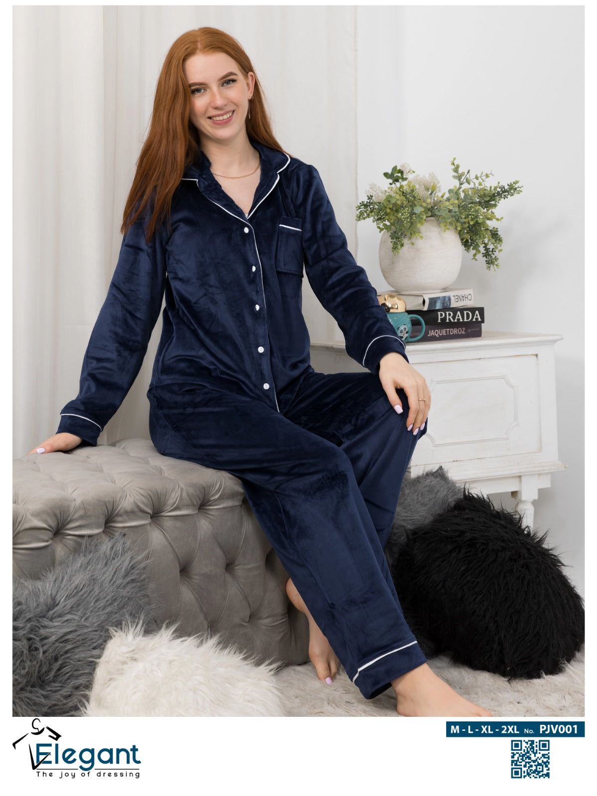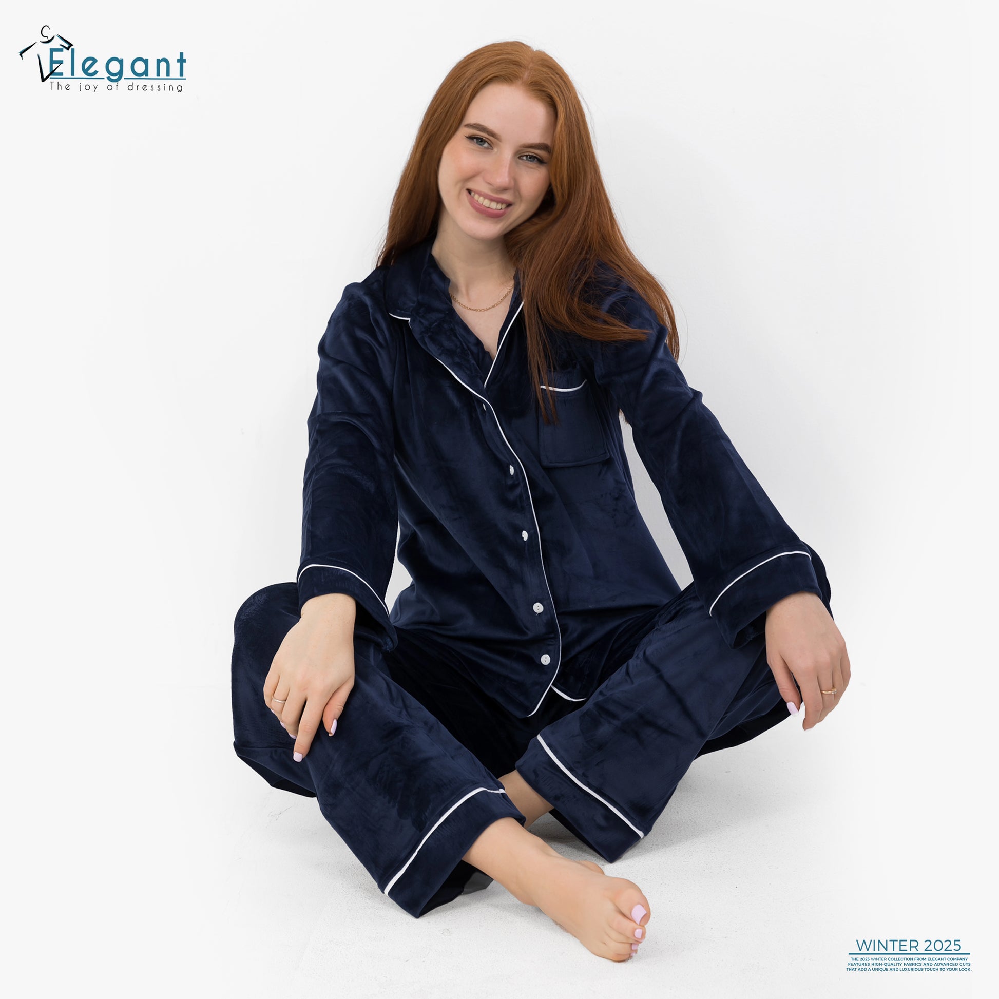 بيجامة كلاسيكية مخملية واسعة الساق - كحلي